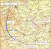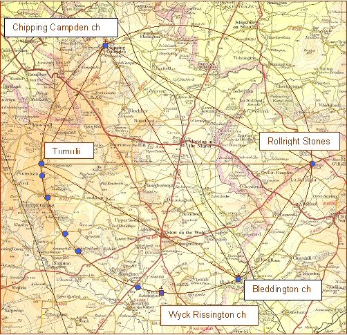 The discovery of another landscape circle was not quite a coincidence. Having found two identical circles overlaying the Marlborough Downs it was natural to look to see if others might exist in different areas. This might sound easy but in practice there are very many complications. Alignments across a single map can be readily spotted. The problem occurs when these same alignments span two maps. As has been mentioned already, the only satisfactory way to be certain of an alignment is to carry out a mathematical calculation. Perhaps in some future date a computer programme will be written that will immediately search for alignments, triangulations and circular patterns in any given area. A project of this magnitude is beyond my capacity for the moment although I would like to propose this concept being taken up as part of the archaeological departments of universities or the County Councils. In the meantime I have to make use of much simpler methods and this requires a bit of luck. To spot a circle overlaying one map is difficult enough, to discover one that spanned two or more maps is far more problematic. At the time of my discovery of the Cotswold pattern I was still working from the old 1" to the mile maps which covered a slightly greater area than the present 1:50,000 Landranger series. This slightly increased my chances he chances of finding another circle, of the same size as those on the Marlborough Downs. Nevertheless it was still a lucky discovery. What attracted my attention this time was not a series of churches, (which had led to my discovery of the first of the Marlborough Downs circles) but a road. This is a very minor road, known as Buckle Street. It that runs from Bourton-on-the-Water through to Chipping Campden. It is quite a long road, as minor roads go running for over 14 kilometres. Its striking feature is that for about 10 kilometres or 6.25 miles it sweeps in a broad arc along the ridge of the Cotswolds. It is not quite a perfect circumference curve, but very nearly so, and the radius of its arc is 9575 metres. It therefore effectively matches the size of the Marlborough Downs circles. This road has an interesting history for it was one of the ancient ‘salt-way’ tracks that probably date from the Neolithic period. Of course the road on its own would be hardly sufficient to claim a discovery of another circular pattern (see Fig. 2). Fortunately this is not the only significant feature. Church Sites Diametrically opposite Chipping Campden lies the parish church of Bledington, Dedicated to St. Leonard it was built between 1150 AD and 1175 AD. Its mellow stone walls and unusual architecture, with some distinctive gargoyle faces, give it an attractive appeal. The church notes state that it may have been built on the site of an earlier Saxon Chapel. Located at the edge of the village It too stands on rising ground and would originally have had good views to the north and west. Bledington church to Chipping Campden church is on a bearing of 331.84° (28.16.° west of true north), the reciprocal bearing is 151.84°. Being positioned diametrically opposite each other on this landscape circle is, as we shall see, highly significant. The sites are not intervisible but an alignment between them could easily have been established with no more than two intermediate positions. These two sites set a key datum alignment for the setting out the other circumference points. The church of St. Laurence at Wyck Rissington also has some interesting associations. The present church is 12th century and it too might have been built on an earlier Christian site. Just after the Second World War the church was in a very bad state of repair and closure seemed the best option. But in 1947 rector Harry Cheales took over and applying considerable zeal helped restore the church. He was something of a Christian mystic and had a vision to build a maze in the grounds of the rectory, which then became the focus for different meditation groups. Mazes, although not mentioned here previously, are another of those pre-Christian sites, which can often be found associated with 'leys'. Several mazes, dating from Celtic times, exist throughout Britain. As with other pagan symbols Christianity often incorporated them into the design of their buildings. Perhaps the most famous of the church mazes can be found set out in the floor of Chartres Cathedral showing the link between Christian and pre-Christian tradition. Sadly the Wick Rissington maze no longer exists, being destroyed when the rectory was sold into private hands. Rollright Stone Circle
