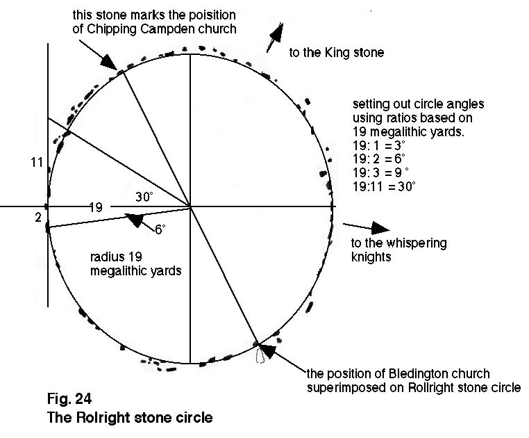 The Rollright Enigma This is one of the very simple ways of creating right-angled triangles. All they would then need to know is which ratios would be required to produce the necessary internal angles. In this particular case they could use either the diagonal from Chipping Campden to Bledington or the diagonal from the Rollright stones to the Heaver barrows. For example, let us suppose that they wished to establish another circumference point which had internal angles of 40° and 50° they would simply need to project alignments based on the angles from the two diameter sites where these two lines crossed would mark a third point on the circle. Architects and surveyors require plans from which to work. What would have been very helpful to our Neolithic surveyors would have been a ground plan from which to make their calculations. Such a plan would need to be set out as a circle, of a reasonable size to accurately check the ratios. The points could then be marked on the circumference in the positions of the intended landscape sites. Realistically it would also need to be durable against the extremes of the British weather and what better material than stone. Once the plan had been established it would act as a working scale model for the landscape surveyors. And where might such a place be? Rollright Template 3° (19:1), 6° (19:2), 9° (19:3) and 30° (19:11) or multiples thereof . The ratios are shown in brackets. These ratios are very accurate in producing the required angles. For example the 19:11 ratio is correct to within 4.2 minutes of arc.