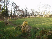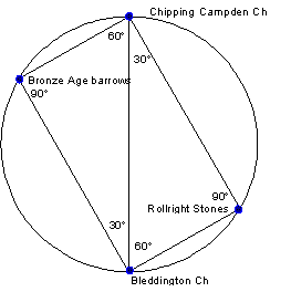 The most significant megalithic point on the Cotswold landscape circle is the Rollright stone circle, which is located almost due east of its centre point. The Rollrights, with the nearby ruins of a portal dolmen called the Whispering Knights and the solitary King’s Stone form an important group. The stone circle, itself, was originally composed of seventy-seven Cotswold stones ranging in height from being almost invisible to 2.1 metres high. Today it is very well weathered. The stones describe an almost a perfect circle, with a diameter of 31.6 metres or 38 Megalithic yards. Legend has it that these were men caught by the devil in revelry and turned into stone. The dating of this monument is thought to be contemporary with other circle sites of similar complexity which would be circa 2500 BC. In addition to the main circle and the dolmen (Whispering Knights) the Warwickshire County Council SMR (Sites and Monuments Record) lists a number of barrows within a hundred metres of so of the King’s Stone indicating the importance of this area 90 - 60 - 30 triangle Diagonally opposite the Rollrights on the other edge of the circle the Gloucestershire CC SMR (archaeological records) lists a possible group of round barrows at this position. These are not shown on the OS sheet but the site is close to Heaver Wood and I shall refer to them hence forth as the Heaver barrows. Because they lie on the diagonal from the Rollrights they too are related to the churches of Campden and Bledington. These four sites create a neat rectangle, based on two 90° - 60° - 30° triangles. Could these placements be a coincidence? I think not.