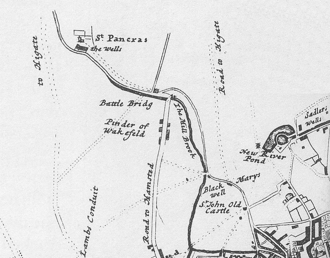 Old plan showing Black Mary's well and the St Pancras well. The map is dated to the early 1700's. Click to enlarge.