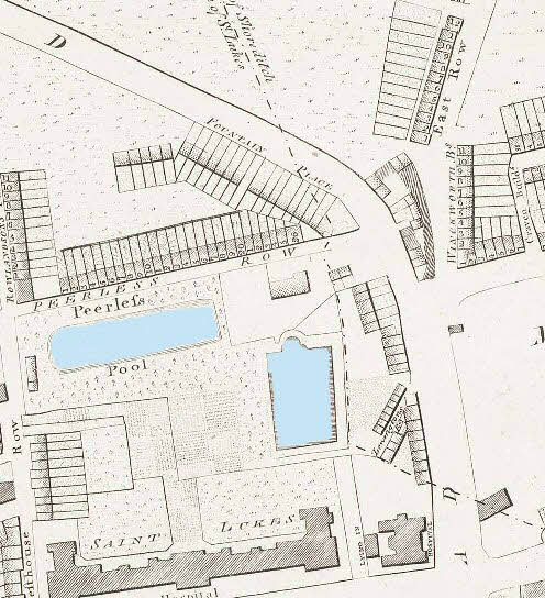 - Shown on Rocques Map and Fairburn's map 1801 but positions' vary. Probably accurately shown on Harwood's map, which is now close to Rhodeswell Road.